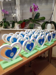 Jednym z najważniejszych elementów dekoracji jubileuszowego wydarzenia były ręcznie robione statuetki autorstwa Teresy – członkini grupy, która słynie z niezwykłej precyzji i talentu do form przestrzennych. Każda statuetka została wykonana osobno, z dużą dbałością o detal, i symbolizuje wspólnotę, energię oraz piękno płynące z aktywności seniorskiej. To nie tylko ozdoby – to osobiste, wyjątkowe symbole dziesięcioletniej historii Klubu.