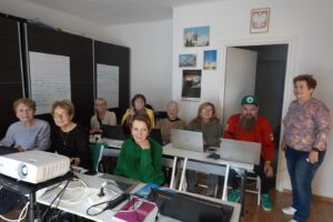 Seniorzy, wyposażeni w swoje laptopy z ciekawością próbowały sił w tworzeniu pierwszych projektów. Podczas warsztatów uczestnicy tworzyli: plakaty, zaproszenia i inne materiały promocyjne, które z pewnością wykorzystają w kolejnych działaniach Klubu. Jak zgodnie przyznali, nauka obsługi Canvy to świetna zabawa, a jednocześnie narzędzie, które daje ogromne możliwości – także w życiu codziennym.