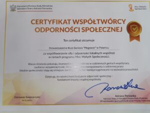 Certyfikat w imieniu Stowarzyszenia Klub Seniora „Megawat” odebrali prezes Ewa Durnaś, Stanisława Imiołek oraz Maciej Duda. To ważne wyróżnienie kończy kilka miesięcy intensywnej pracy, edukacji i integracji seniorów wokół tematyki bezpieczeństwa cyfrowego.