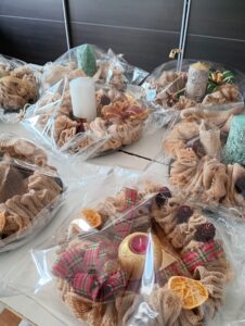 Spotkania twórcze były nie tylko okazją do pracy artystycznej, ale również do wspólnego spędzenia czasu, rozmów i budowania świątecznego nastroju. Każdy wianuszek powstawał ręcznie, z ogromną starannością i dbałością o detale. Seniorki wykorzystywały naturalne materiały – jutę, ozdobne świece, szyszki, suszone owoce, wstążki oraz świąteczne ozdoby – tworząc niepowtarzalne, eleganckie kompozycje.