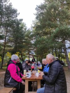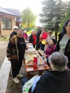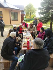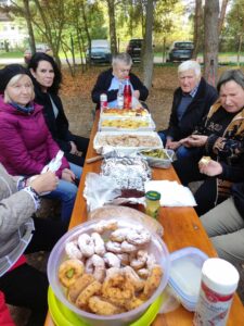Nie zabrakło też słodkiej niespodzianki – nasi przyjaciele, Kazia i Stanisław Czechowscy, zadbali o pyszne domowe ciasta, które dopełniły smak jesiennego popołudnia. Przy cieple ognia i muzyce seniorzy wspominali dawne czasy – zwłaszcza panowie, którzy z humorem opowiadali historie z okresu służby wojskowej jak i lat młodości .